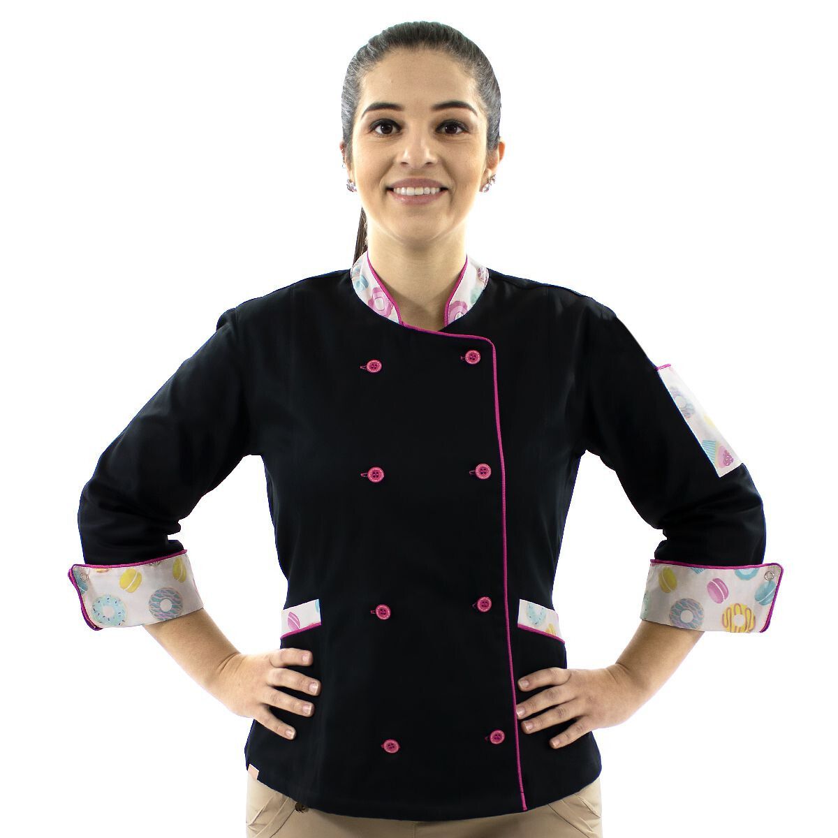 A bela vestimenta de uma chef inspira o preparo de deliciosos pratos, seja a diferença na sua cozinha com seu lindo uniforme e se destaque por tamanha beleza e valor que traz à sua imagem profissional. Fechamento duplo por botões rosa para melhor caimento da peça no corpo, com modelagem acinturada e cinto de amarrar nas costas que deixa a dólmã perfeitamente ajustada ao corpo. Detalhes em estampa de doces nos punhos, bolsos e gola para uma peça mais charmosa e delicada além de confeccionada em tecido leve e fresco oferecendo maior conforto na rotina. Perfeita para uso em confeitarias, padarias ou eventos trazendo muito charme e estilo para a mais bela e talentosa chef!